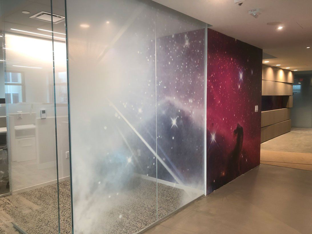 This project spanned multiple floors in the American Geophysical Union’s location in Washington DC. DodgeChrome printed and installed full wall panels of Mystical wall coverings and full clear film panels onto glass to achieve an image that crossed both materials as well as wrapping around corners. This look allows privacy when in conference rooms and glass work spaces while maintaining a cohesive look throughout the space.